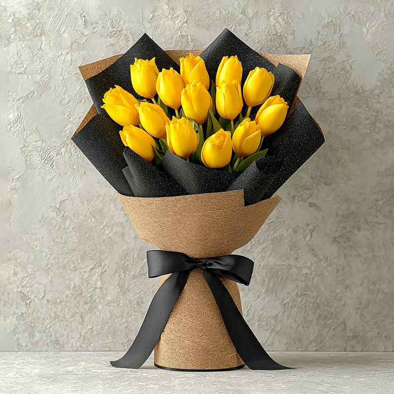 This bouquet of yellow tulips is a whisper between the sun and the earth. The radiant yellow petals seem to hold the blazing summer sun, each bloom glowing with vibrant warmth. The rustic brown wrapping resembles the embrace of the earth, steadily cradling the overflowing light. A black ribbon ties into an elegant knot, softly declaring, "Let a whole bright morning be wrapped in this bouquet." One glance, and you fall into a whirl of warm yellow — even the breeze carries the freshness of golden fields, gently telling a sunlit story.