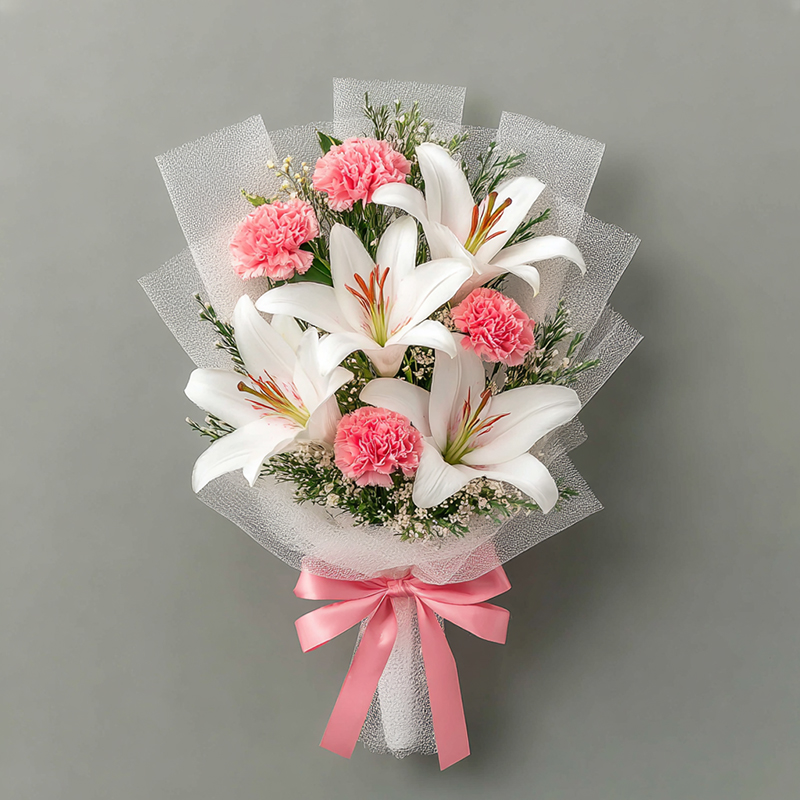 This bouquet is a whisper of moonlight and morning dew.White lilies unfold their pure petals, dancing like snowy dreams;