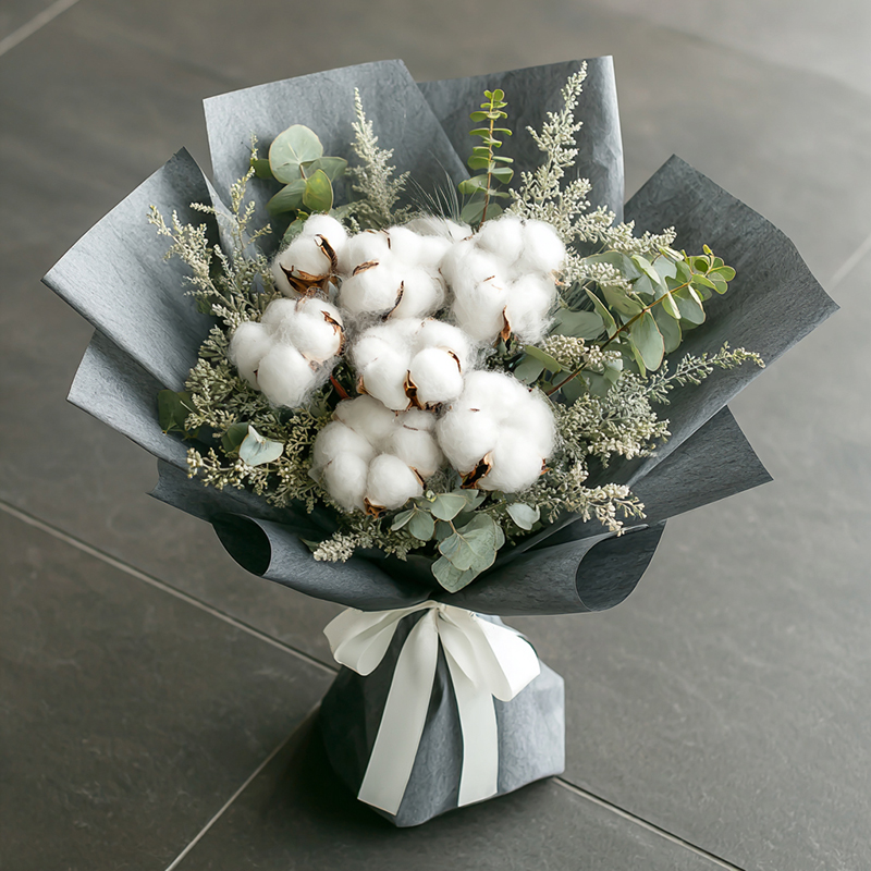 This bouquet is a winter whisper. Cotton bolls resemble snow, holding the stillness of the year's end; eucalyptus leaves glisten like jade, adding a crisp freshness. Wrapped in pale grey paper and tied with a white ribbon, it gathers the purity and quiet of winter into this fragrant embrace. Set upon grey ground, each bloom softly says: "With cotton as snow, and leaves as wind, I gift you an entire serene winter," a humble yet healing beauty, like warmth from an old memory, gently arriving.